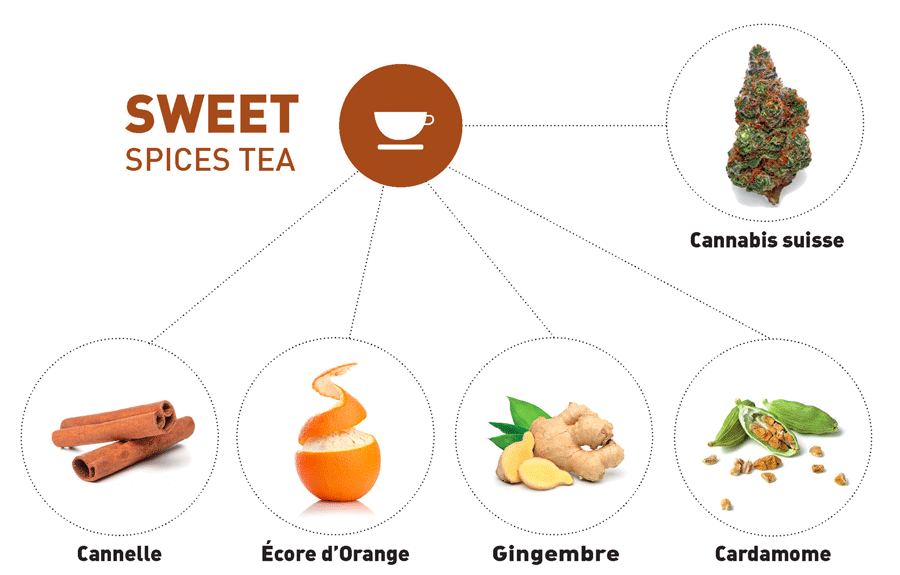 cannelle, écorce d'orange, girofle, gingembre, cardamome, réglisse, fenouil, racines de dent de lion, baies de genièvre, poivre, cannabis suisse indoor